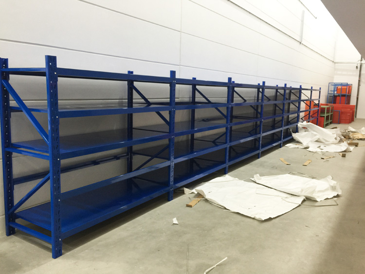 苏州某中外合资压缩机公司中型货架安装完工,立柱采用40*80*1.5C型钢,横梁采用40*60*1.2P型管,层板0.8厚,二板四筋,每层承载300KG以上。