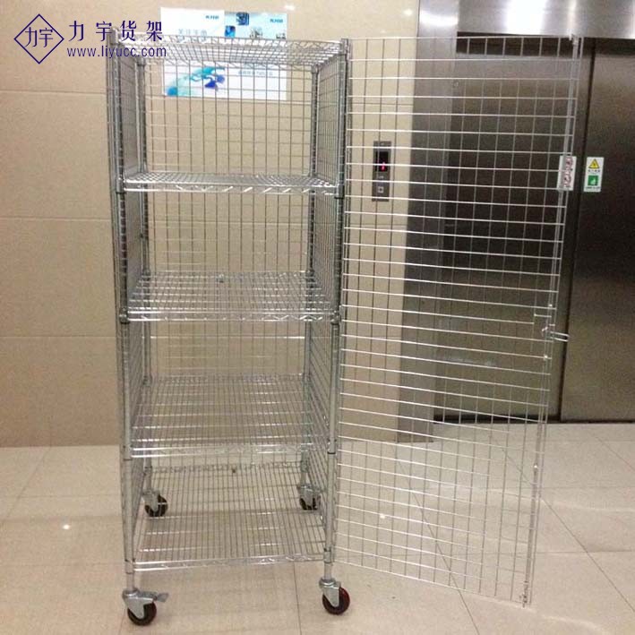 防静电笼车,四面侧封,前面开门,尺寸可定做。 常规尺寸: L900*W350*H1600 L1200*W450*H1600 L1800*W600*H1800 表面镀铬,可以装配脚轮