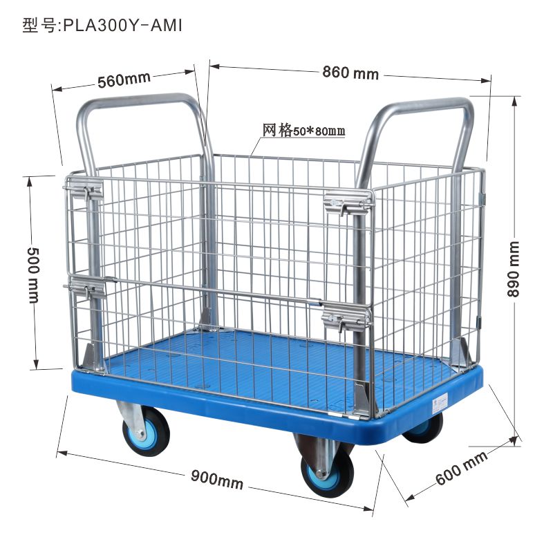 车板外形:910(L)×600(W)mm 车板高度:220mm 扶手高度:890mm 脚轮直径:130mm 自重:25kg 最大载重:300kg